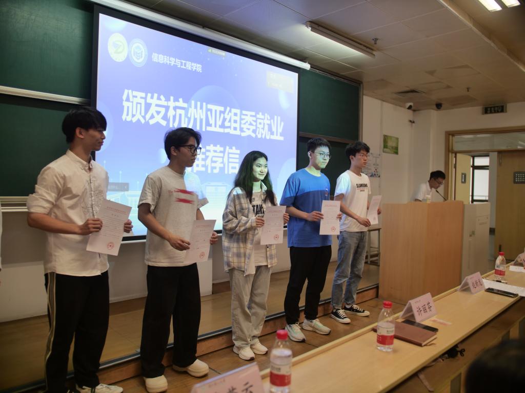 许丽芬为受到杭州亚组委表彰的21级志愿者代表颁发杭州亚组委就业推荐信。