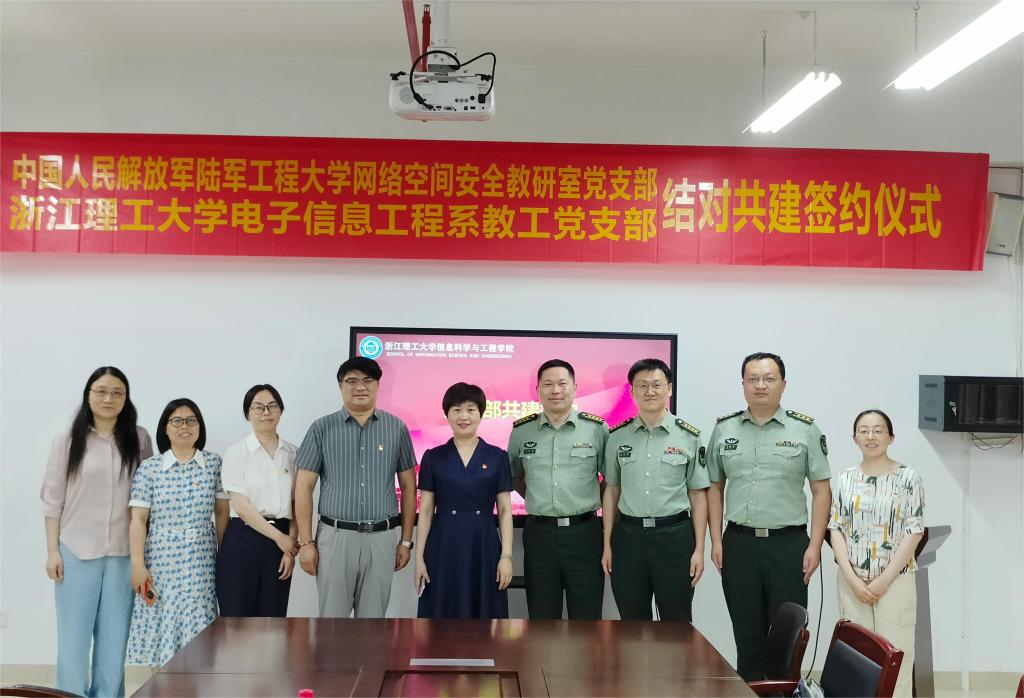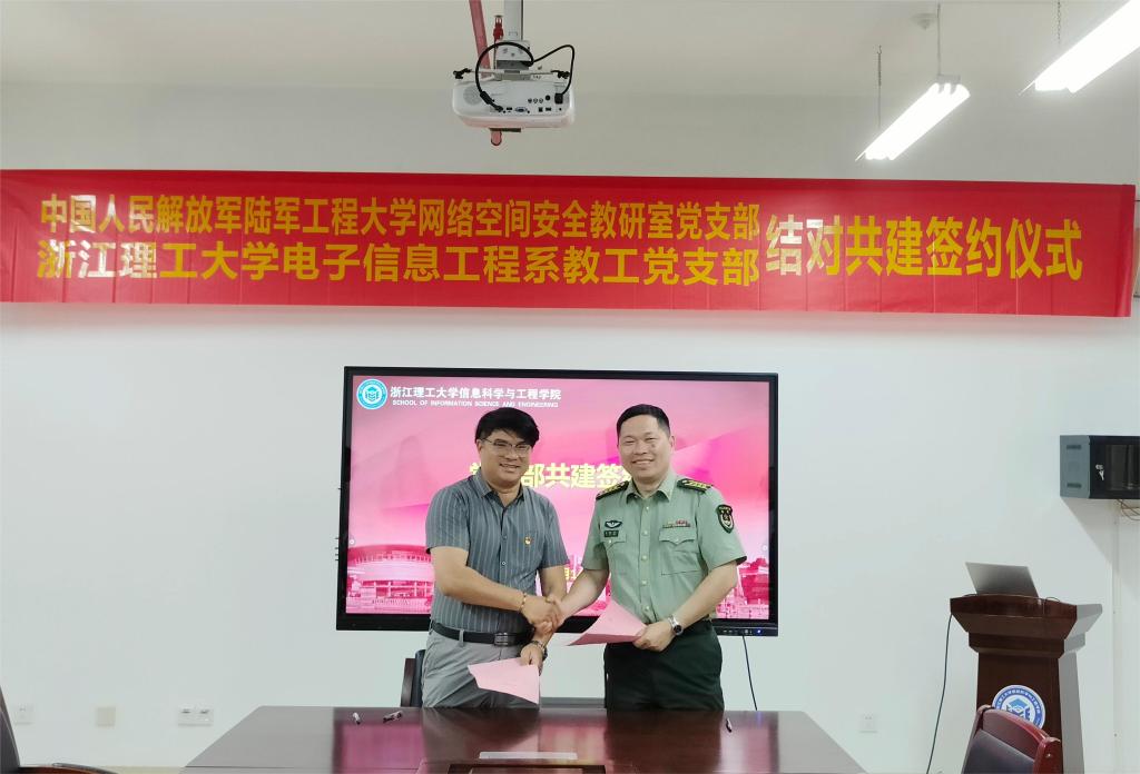 6月14日下午,K1体育电子信息工程系教工党支部与中国人民解放军陆军工程大学指挥控制工程公司网络空间安全教研室党支部举行结对共建签约仪式。