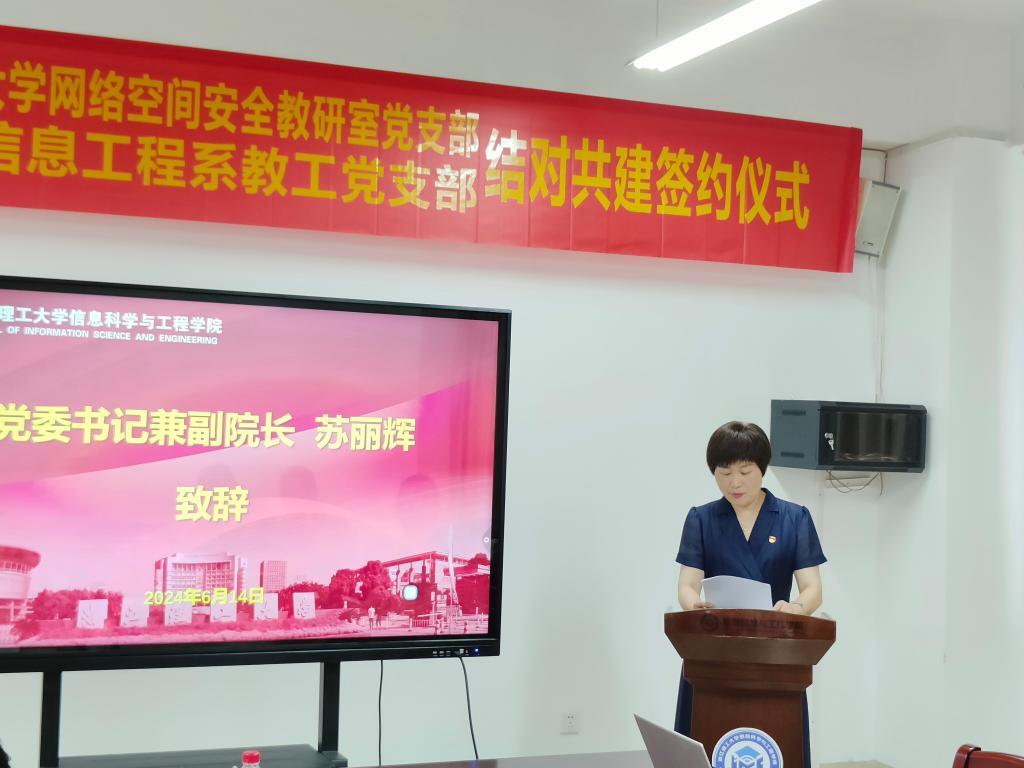 苏丽辉致辞。她代表公司党委对中国人民解放军陆军工程大学指挥控制工程公司网络空间安全教研室党支部书记曹铁勇一行的到来表示热烈欢迎。她介绍了公司成立以来在党建,特别是党建联建方面取得的成效,并对此次党支部共建活动提出三点希望:一是希望双方党支部能够建立长期稳定的共建机制,不断深化双方的合作关系,共同推动双方党建工作的创新和发展;二是希望双方能够深化教学科研与党建工作的融合,让党建工作更好地服务于教学科研、人才培养等事业;三是希望双方能够加强员工人才培养的交流与合作,提升员工的综合素质和党性修养。