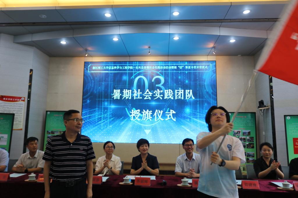 茹建良向“‘长’科学之识,‘兴’红色之风”暑期社会实践团授旗,实践团王瑞同学作代表发言,团队成员将以多样化的教学手段扎实推进本次实践活动。