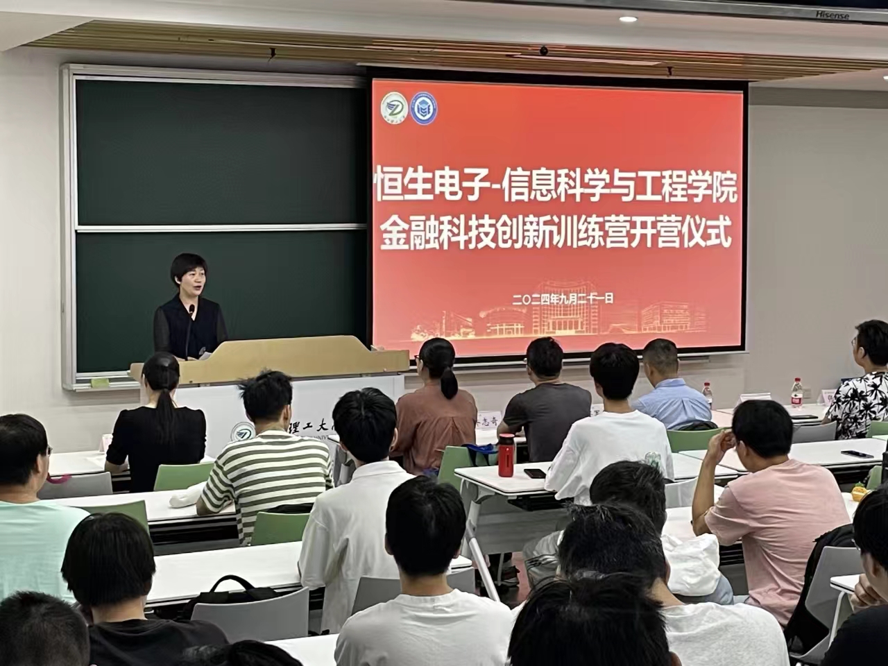 苏丽辉致辞。她首先对到场的各位嘉宾表示欢迎,对恒生电子提供的教学支持表示感谢。她指出,公司在专业实习课程中引入训练营方式,旨在丰富同学们的工程背景,拓宽同学们的行业视野,在电子信息技术服务金融行业的真实工作场景任务中,培养同学们的创新精神和实践能力,提高同学们的综合素质。她希望同学们能够把握好这次机会,了解行业现状,规划未来;在行业实战中勤奋学习,拓展技能;在有限的时间内团队协作,共同进步,发挥自己的知识技能,勇于创新,敢于挑战,展现好浙理风采。