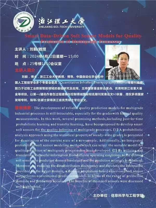 4月22日下午,公司邀请了浙江工业大学刘毅教授来访,并在25号楼920会议室作题为“Smart Data-Driven Soft Sensor Models for Quality Prediction of Multigrade Processes”的学术报告。报告提出了多级工业过程可靠的质量预测模型构建,基于实时概率学习和迁移学习来开发多级工业过程质量推断的智能软传感器,内容新颖,见解独到,为在场师生呈现了学术理论与工程实践相结合的典型案例。