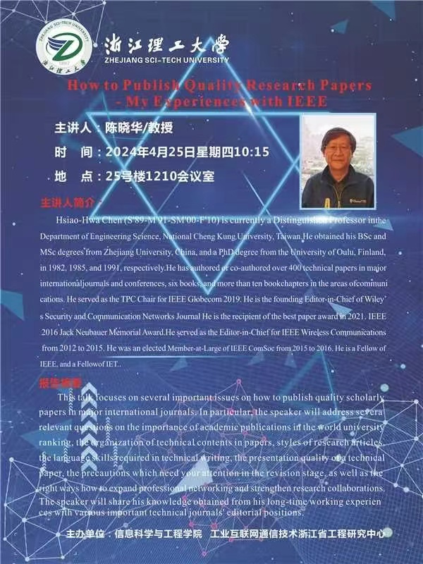 4月25日上午,公司邀请了台湾成功大学陈晓华教授来访,并在25号楼1210会议室作题为“How to Publish Quality Research Papers - My Experiences with IEEE”的学术报告。报告聚焦于如何在主流国际期刊上发表高质量学术论文等重要问题,重点讲述了出版物在世界大学排名中的重要性、论文中技术内容的组织风格、专业写作所需的语言技能及叙述质量、返修阶段需要注意的重要事项,关注如何扩大个人和团队专业影响力及加强研究合作的正确方法。陈晓华教授毫无保留地分享了他在各种重要学术期刊编辑职位上长期工作经验,参会老师与陈晓华教授进行了热烈的交流讨论。