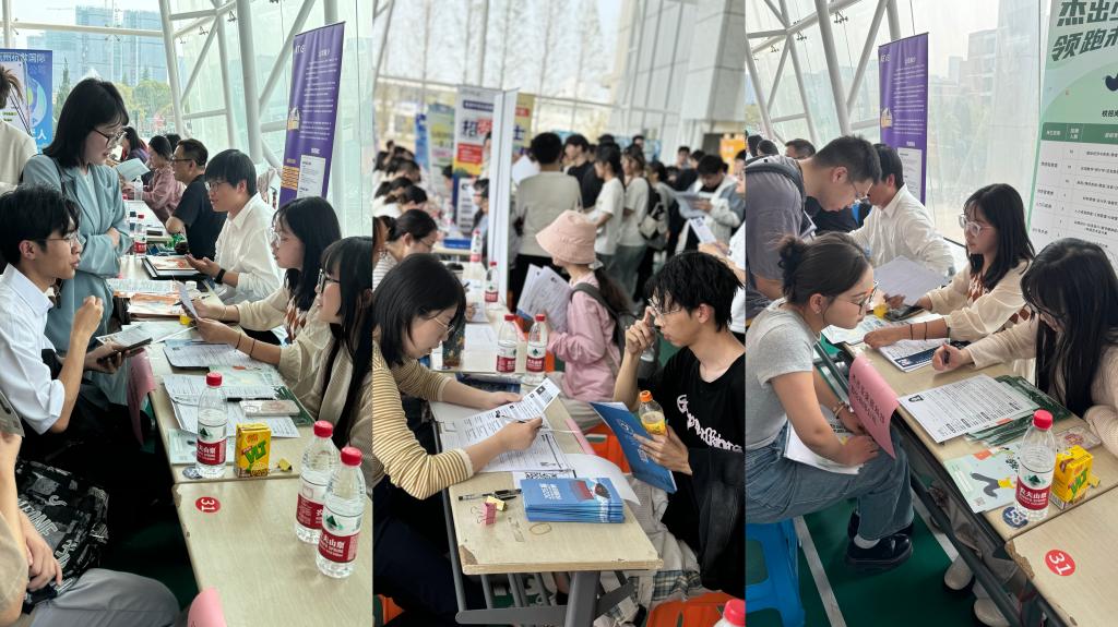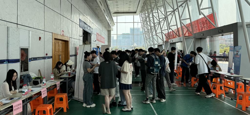 下沙校区体育馆楼前人流涌动,气氛热烈。经邀请报名和资格审核,来自全国各地的72家国有企业、上市公司、各类企业单位和机构来到了现场。除了应届研究生、本科生毕业生外,还有中低年级员工前来了解企业人才发展路径、工作能力要求、福利待遇等就业市场信息。
