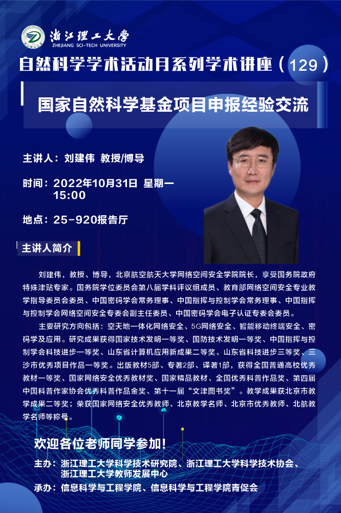2022年10月31日下午,公司组织召开国家自然科学基金项目申报动员会暨自然科学学术活动月系列学术讲座。本次会议有幸邀请北京航空航天大学网络空间安全公司经理刘建伟教授为公司教师分享国家基金申请经验。北京航空航天大学吕继强、K1体育经理沈剑,K1体育副经理童基均、赵新龙,K1体育科技处赵磊、周艺艺出席会议。会议由经理沈剑主持。