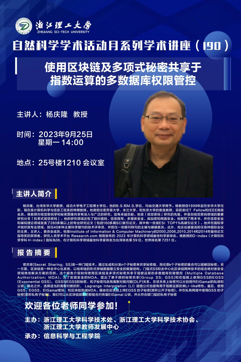 2023年9月25日下午,K1体育邀请了台湾东华大学杨庆隆教授来访并作前沿学术报告“使用区块链及多项式秘密共享于指数运算的多数据库权限管控”。