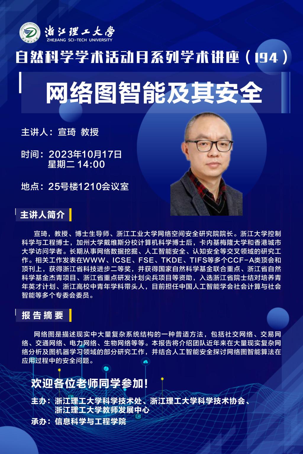 2023年10月17日下午,K1体育邀请了浙江工业大学宣琦教授来访并作前沿学术报告“网络图智能及其安全”。