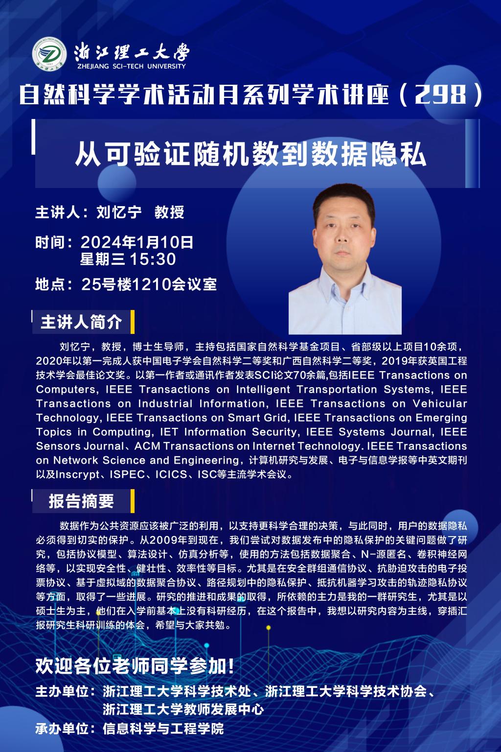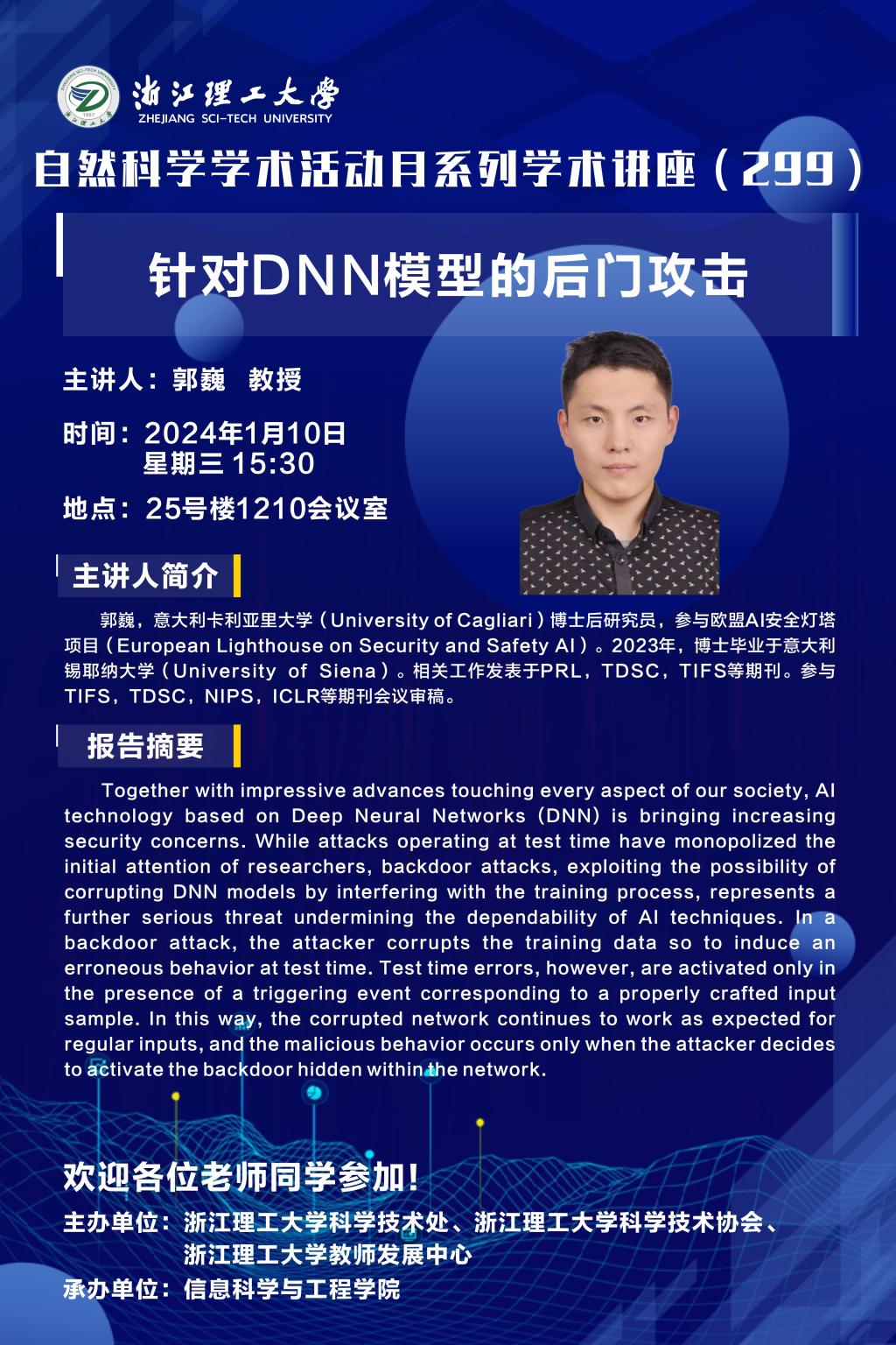 2024年1月10日下午,K1体育邀请桂林电子科技大学刘忆宁教授,意大利卡利亚里大学郭巍教授来访并分别做前沿学术报告“从可验证随机数到数据隐私”,“针对DNN模型的后门攻击”。
