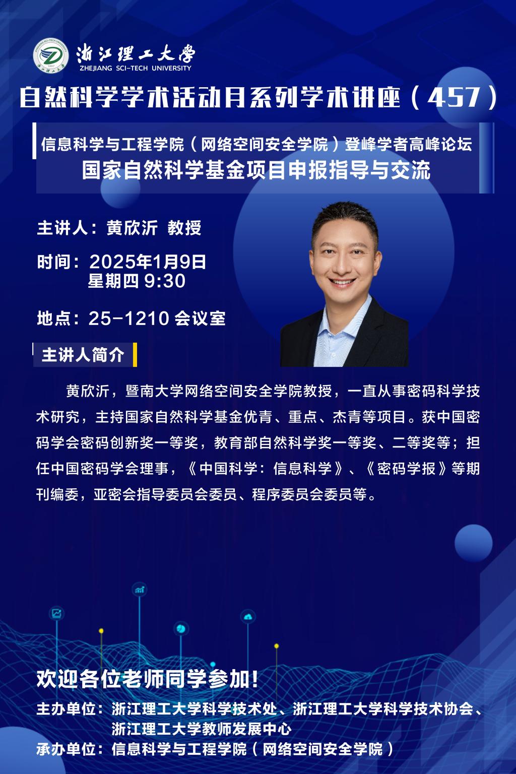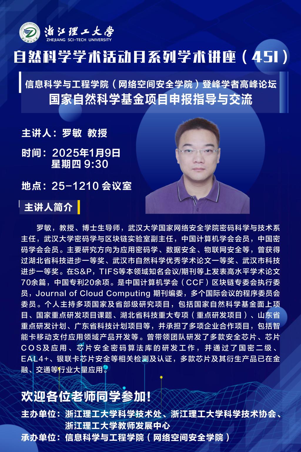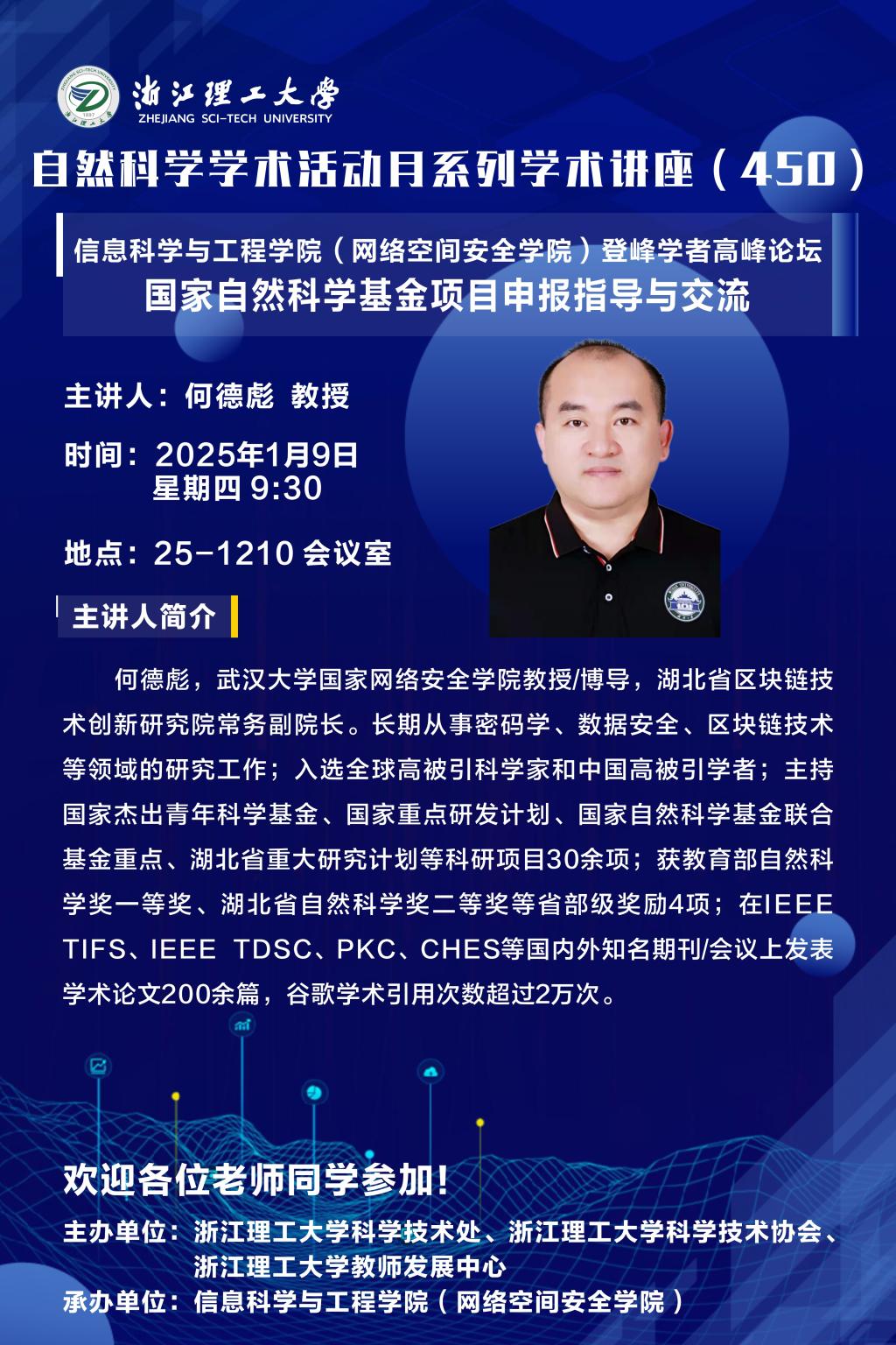 2025年1月9日上午,K1体育登峰学者高峰论坛(第三期)在25号楼1210会议室举行。本次学术交流活动主要围绕“国家自然科学基金项目申报指导与交流”展开。公司邀请武汉大学国家网络安全公司何德彪教授、中国民航大学杨宏宇教授、暨南大学网络空间安全公司黄欣沂教授、武汉大学国家网络安全公司罗敏教授、澳门城市大学数据科学公司朱天清教授、北京信安世纪科技股份有限公司研发副总裁胡进博士为公司2025年申报国家自科科学基金项目的老师进行现场指导。