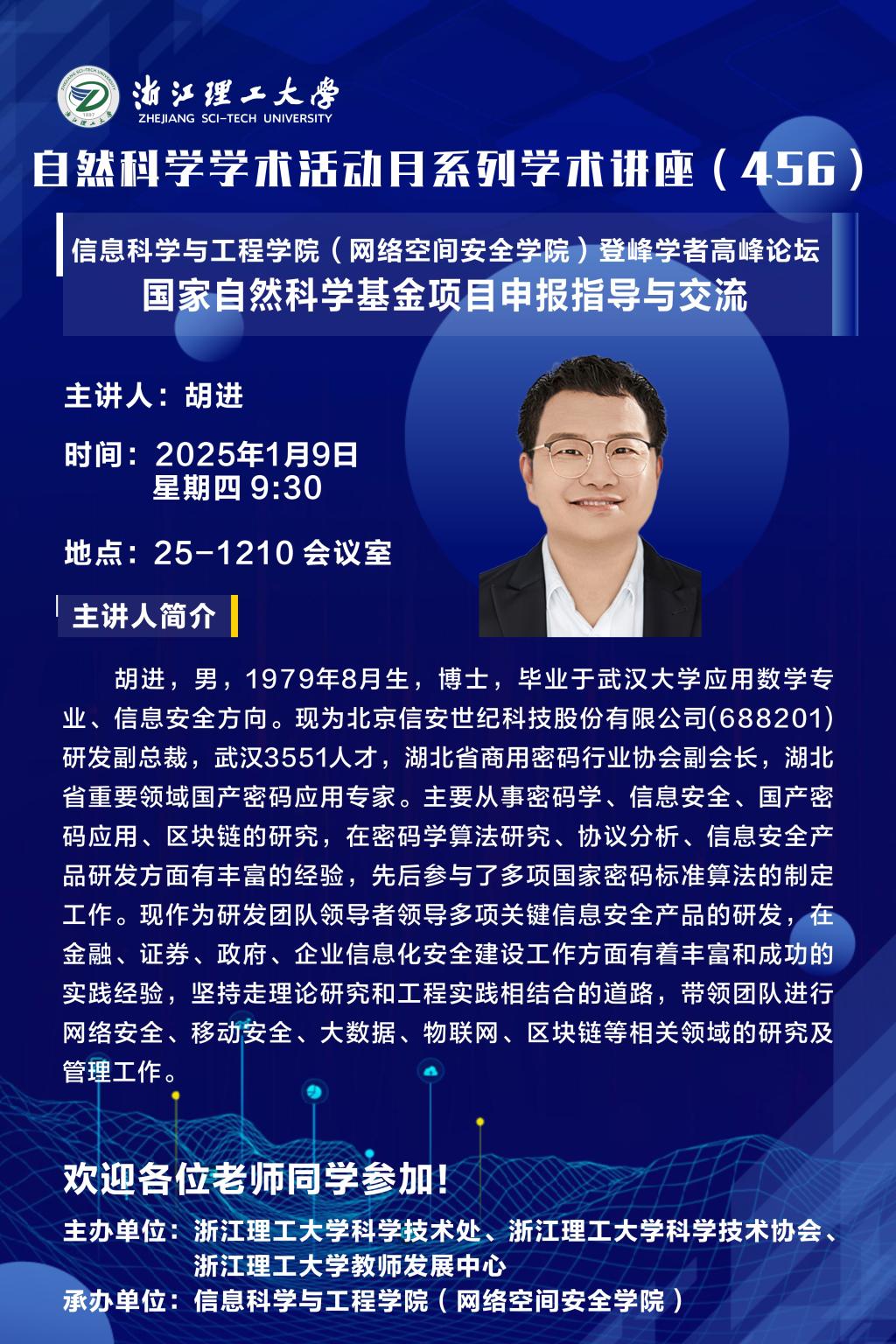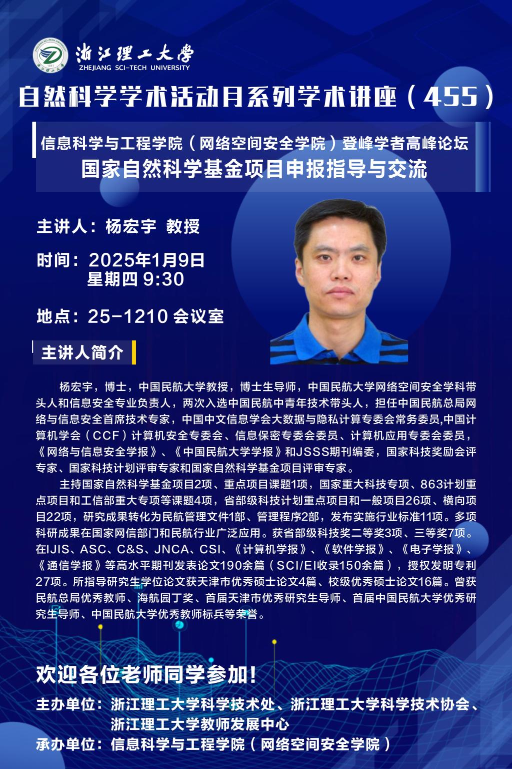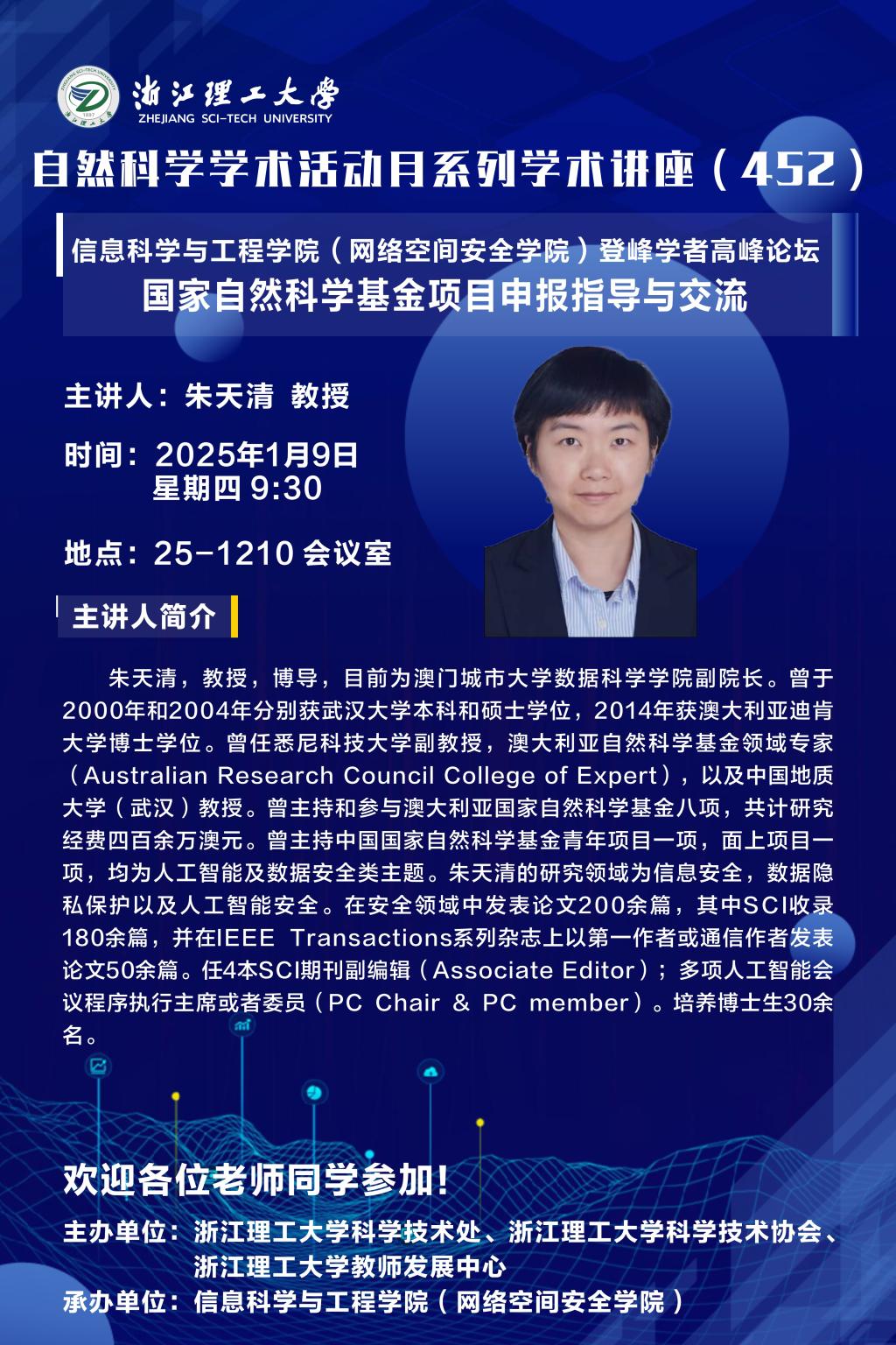 2025年1月9日上午,K1体育登峰学者高峰论坛(第三期)在25号楼1210会议室举行。本次学术交流活动主要围绕“国家自然科学基金项目申报指导与交流”展开。公司邀请武汉大学国家网络安全公司何德彪教授、中国民航大学杨宏宇教授、暨南大学网络空间安全公司黄欣沂教授、武汉大学国家网络安全公司罗敏教授、澳门城市大学数据科学公司朱天清教授、北京信安世纪科技股份有限公司研发副总裁胡进博士为公司2025年申报国家自科科学基金项目的老师进行现场指导。