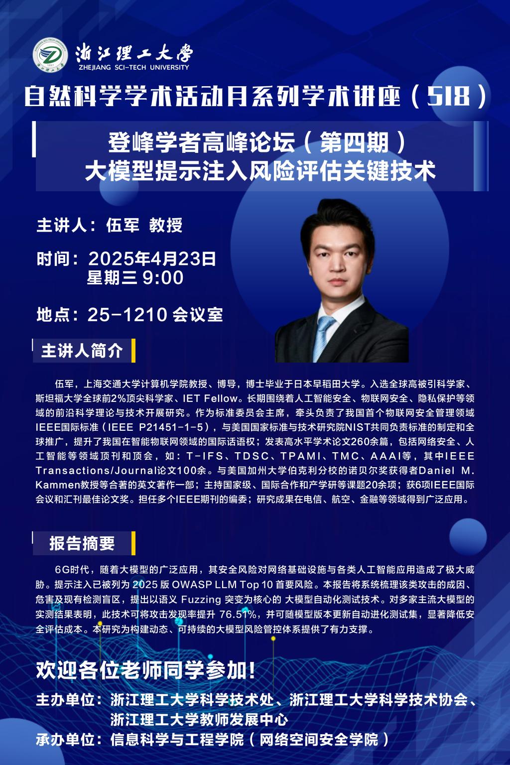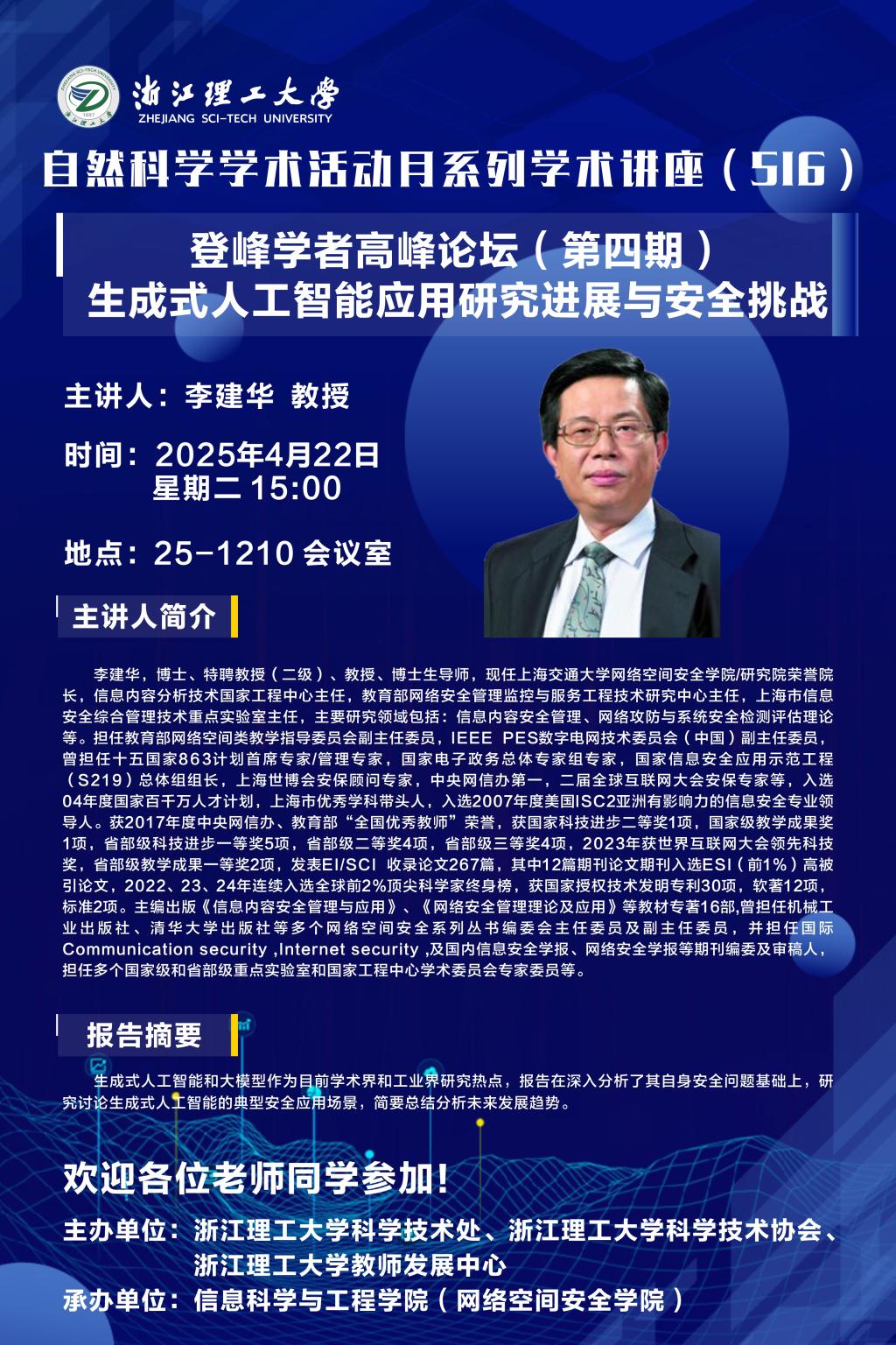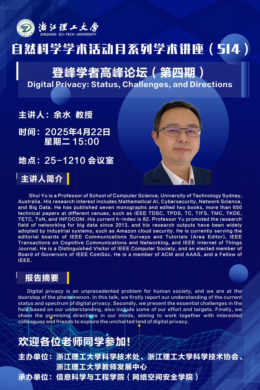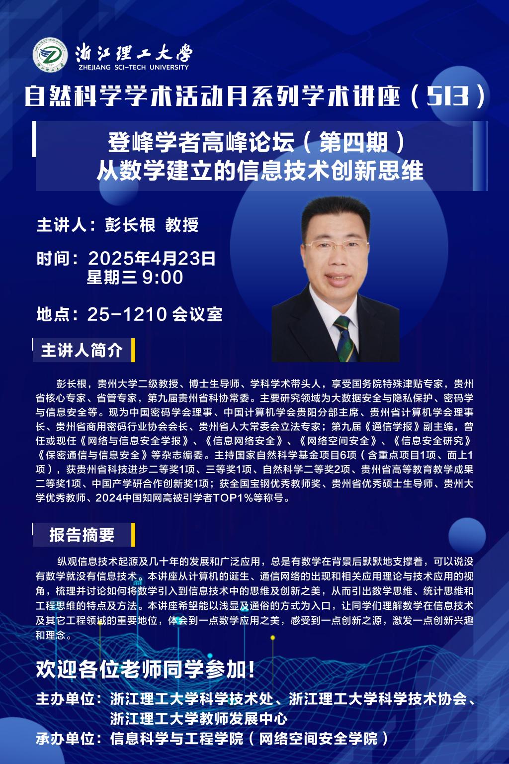 2025年4月22日-4月23日,K1体育登峰学者高峰论坛(第四期)在25号楼1210会议室举行。会议邀请上海交通大学李建华教授,悉尼科技大学余水教授,贵州大学彭长根教授,中国民航大学杨宏宇教授,上海交通大学伍军教授前来做学术报告。