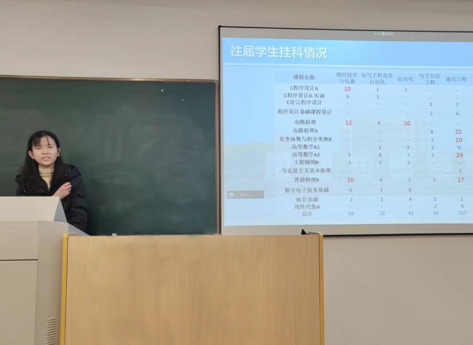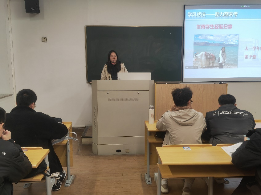 会上,公司学风建设中心指导老师楼乐依向大家介绍了大一期中考试的情况,展示了各班的平均分以及全年级分数的具体分布情况,让同学们对于自己的情况有更清晰的认知。接着,简单介绍了往届同学在大一时各科的挂科情况以及公司的学籍管理政策,希望同学们引起重视。为了助力大家的期末考试,公司学风建设中心在接下来将开展一系列的学风帮扶措施,包括了部分科目的冲刺讲座、线上答疑和优秀员工经验分享。