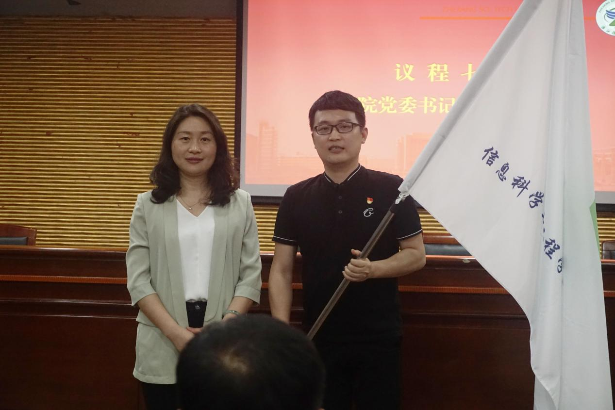 苏丽辉为首届青促会授旗,青年教师张烈山代表理事会接旗。