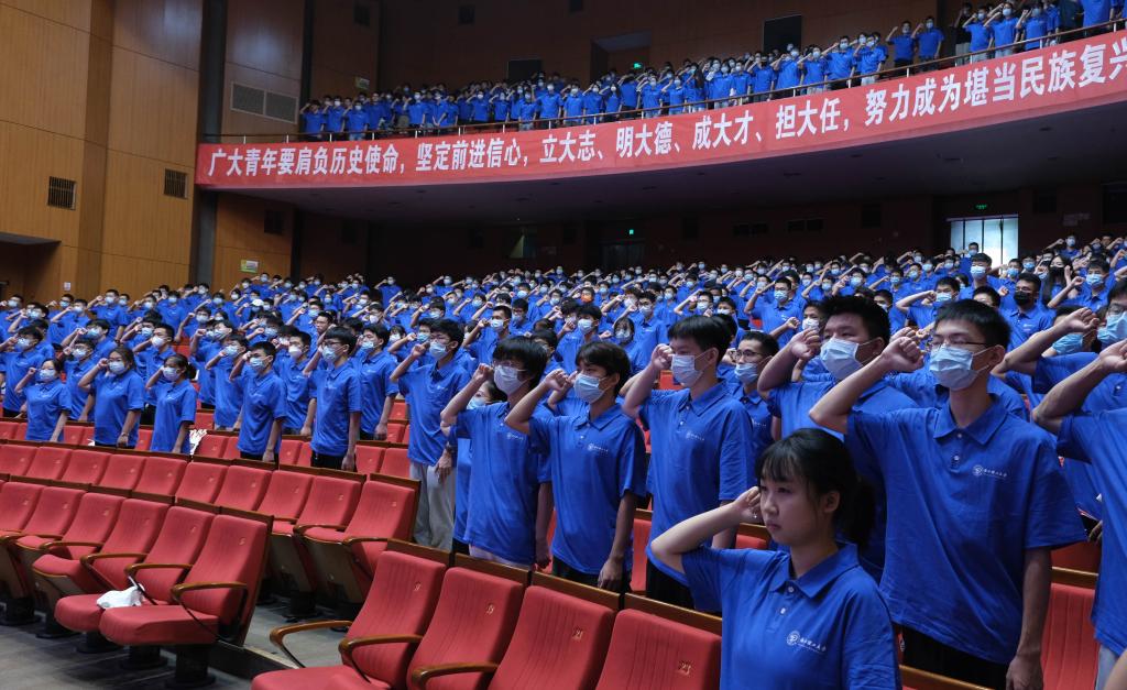 主席台领导先后给本科生、研究生员工代表佩戴了校徽;其余新生集体自行佩戴了校徽。随后,新生进行入学宣誓。这一刻,在场的每一位新生共有浙理信息人的身份,共担使命,共赴荣光。