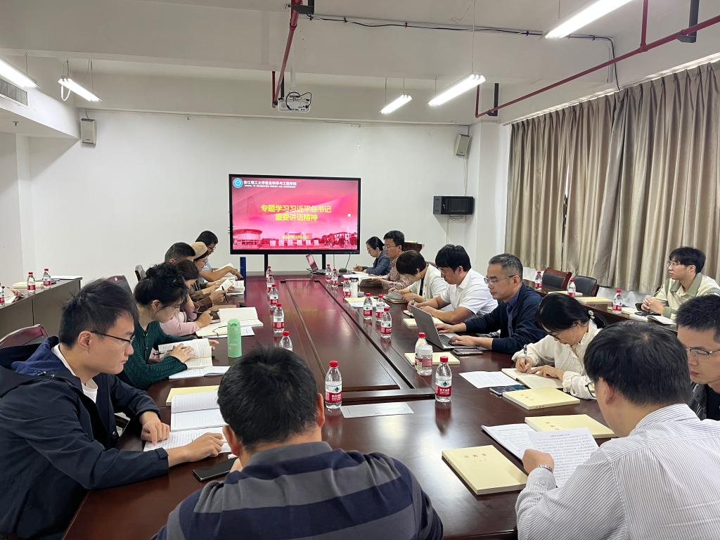 副经理童基均领学习近平总书记关于教师队伍建设的重要指示批示精神。电气工程系教工党支部书记、系主任李俊峰,自动化系教工党支部书记、系副主任葛正,电子信息工程员工党支部书记孙童三位同志就全国教育大会精神学习作交流发言。副经理赵新龙领学《论教育》,与会人员就《论教育》的学习分享感悟。